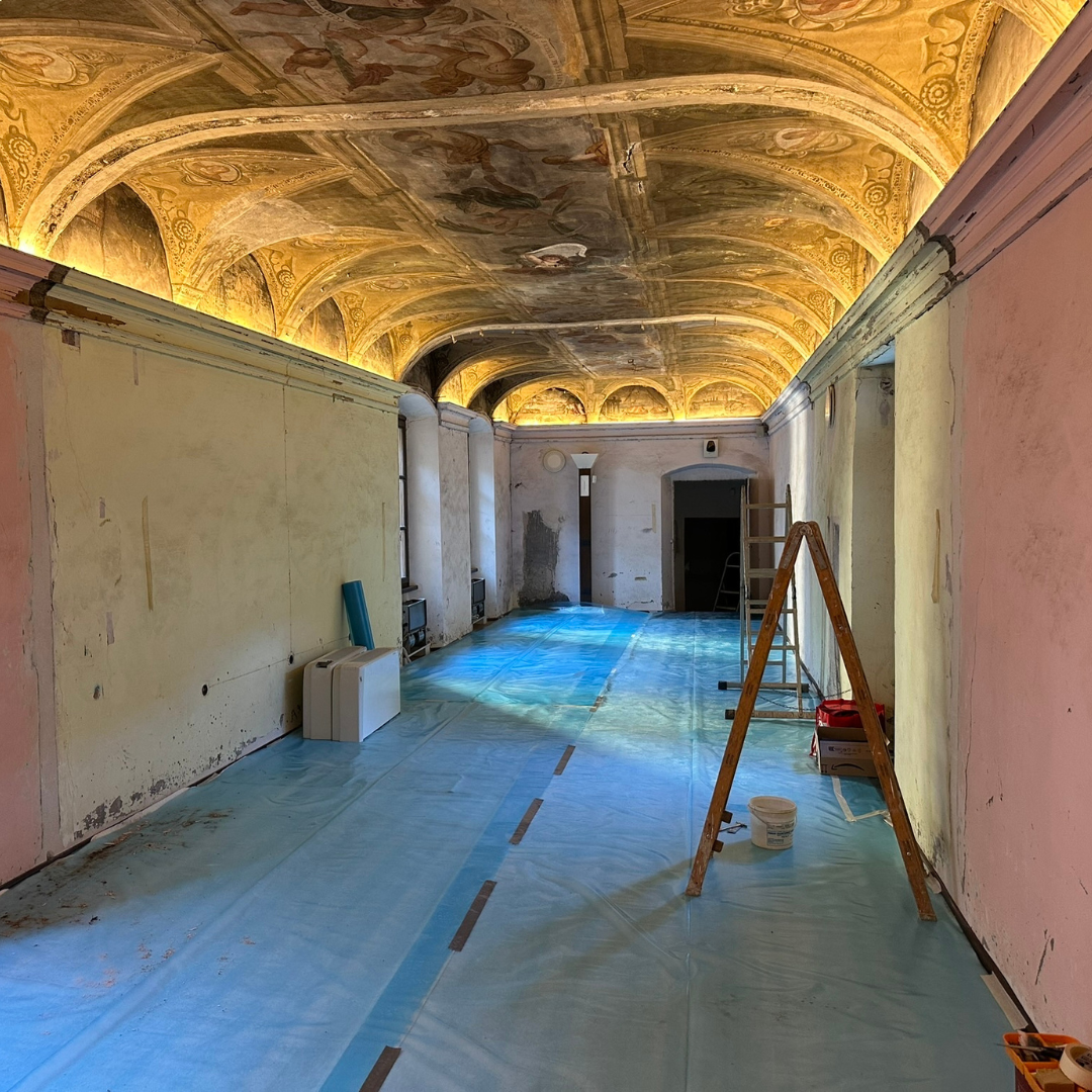 Dopo i lavori di consolidamento strutturale, adeguamento impiantistico e recupero degli ornamenti nel corpo nord, l’intervento attuale interessa nuovi ambienti, tra cui il saloncino verso via Nuova, impreziosito da un soffitto a crociera lunettata con pitture di pregio.