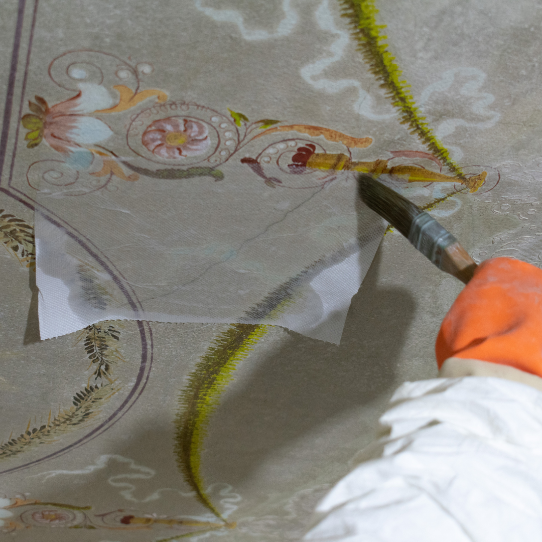 Prosegue il progetto di valorizzazione di Palazzo Taddei ad Ala: stiamo curando il restauro dei dipinti murali di cinque stanze al primo piano, quattro nell’ala ovest e una nell’ala sud. L’edificio, nato nel XV secolo e trasformato tra la fine del XVII e la prima metà del XVIII, conserva una facciata sobria in pietra a bugnato e una corte interna con loggiato ornato da mascheroni. Gli interni custodiscono affreschi allegorici seicenteschi e decorazioni ottocentesche.